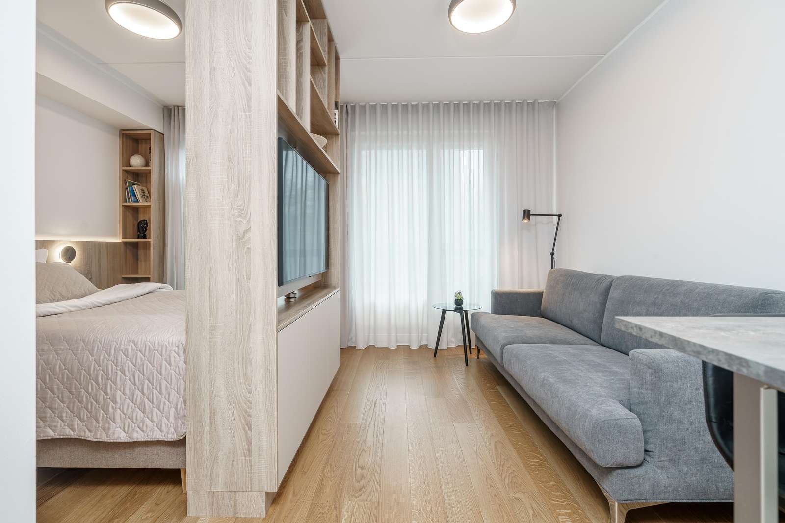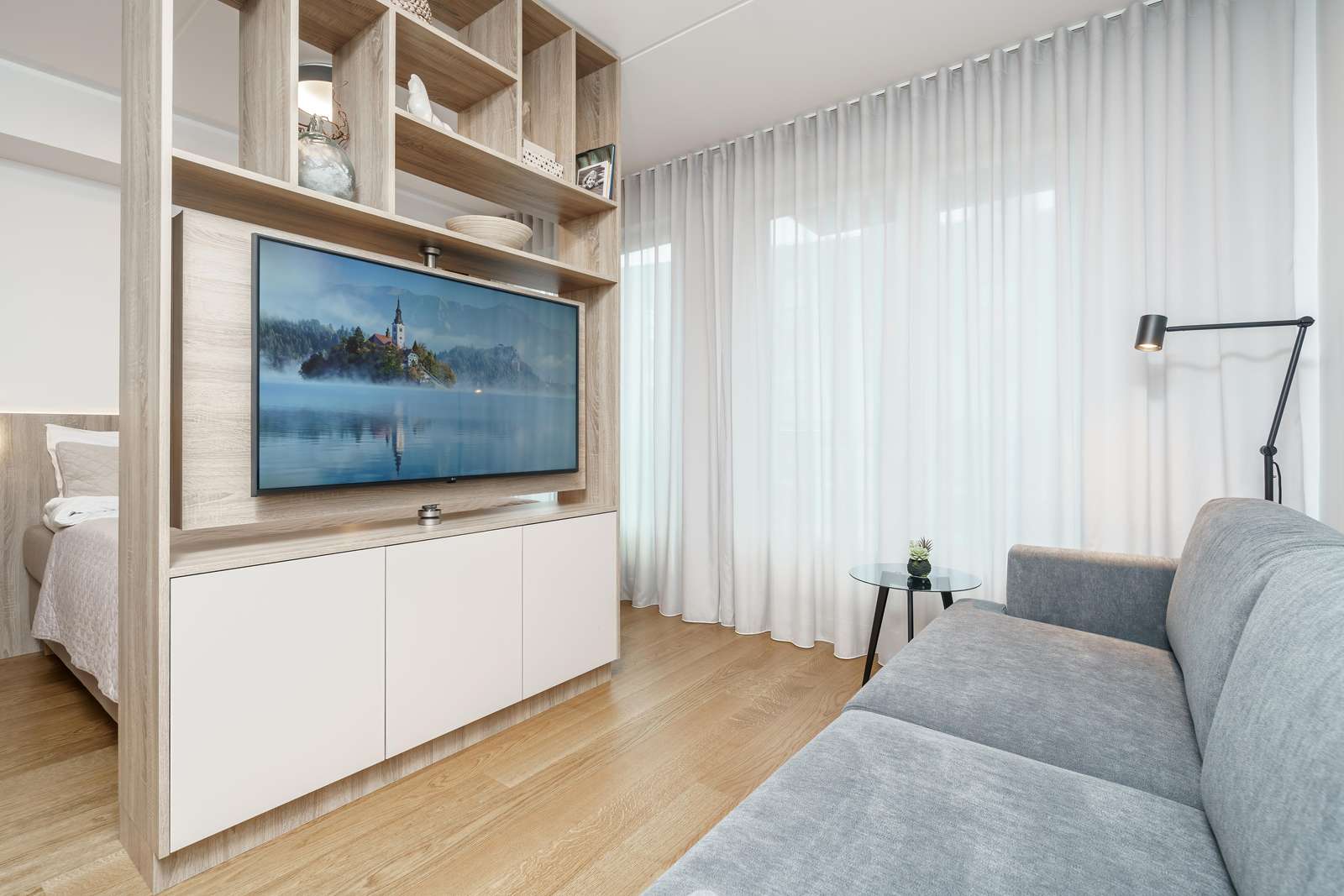 ⬩Living area: Comfortable sofa, TV, heating, and large windows for natural light. A partition shelf separates the living and sleeping areas for privacy.