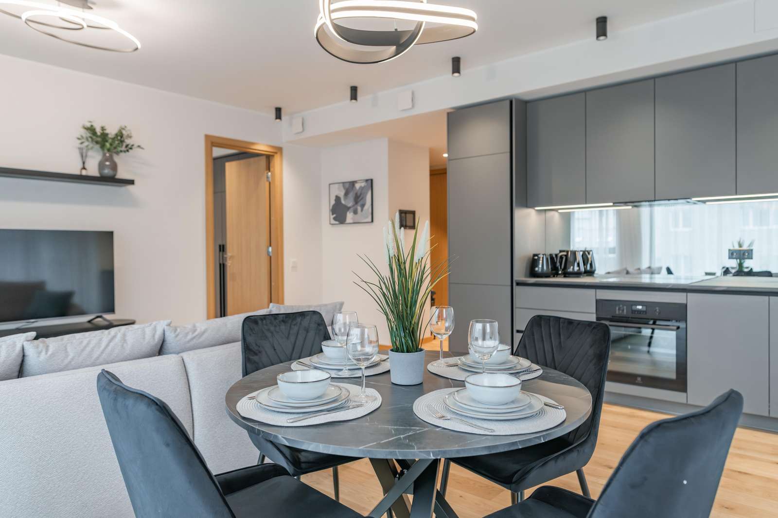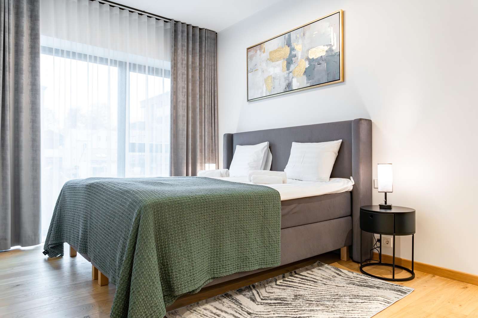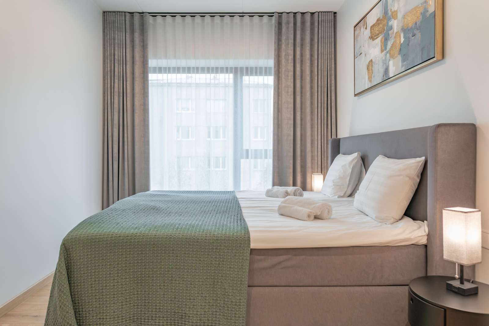 Stay in a spacious and modern 2-bedroom apartment with balcony and view to the sea! Apartment has a bright living room, furnished balcony, two bedrooms, fully equipped kitchen and a shower. Perfect for couples, small families and business travellers. Free 100MB Wi-Fi, stylish interior and underground parking makes your stay comfortable and convenient.