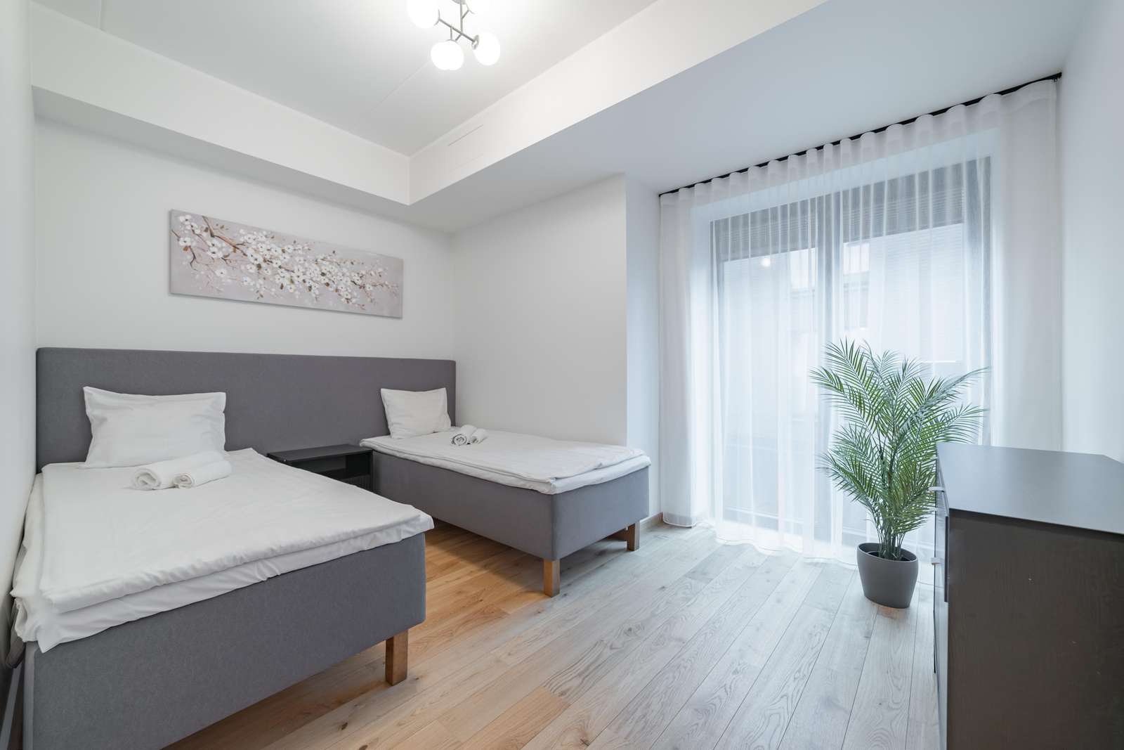 ⬩Bedroom 2: Two single beds and large windows for natural light.