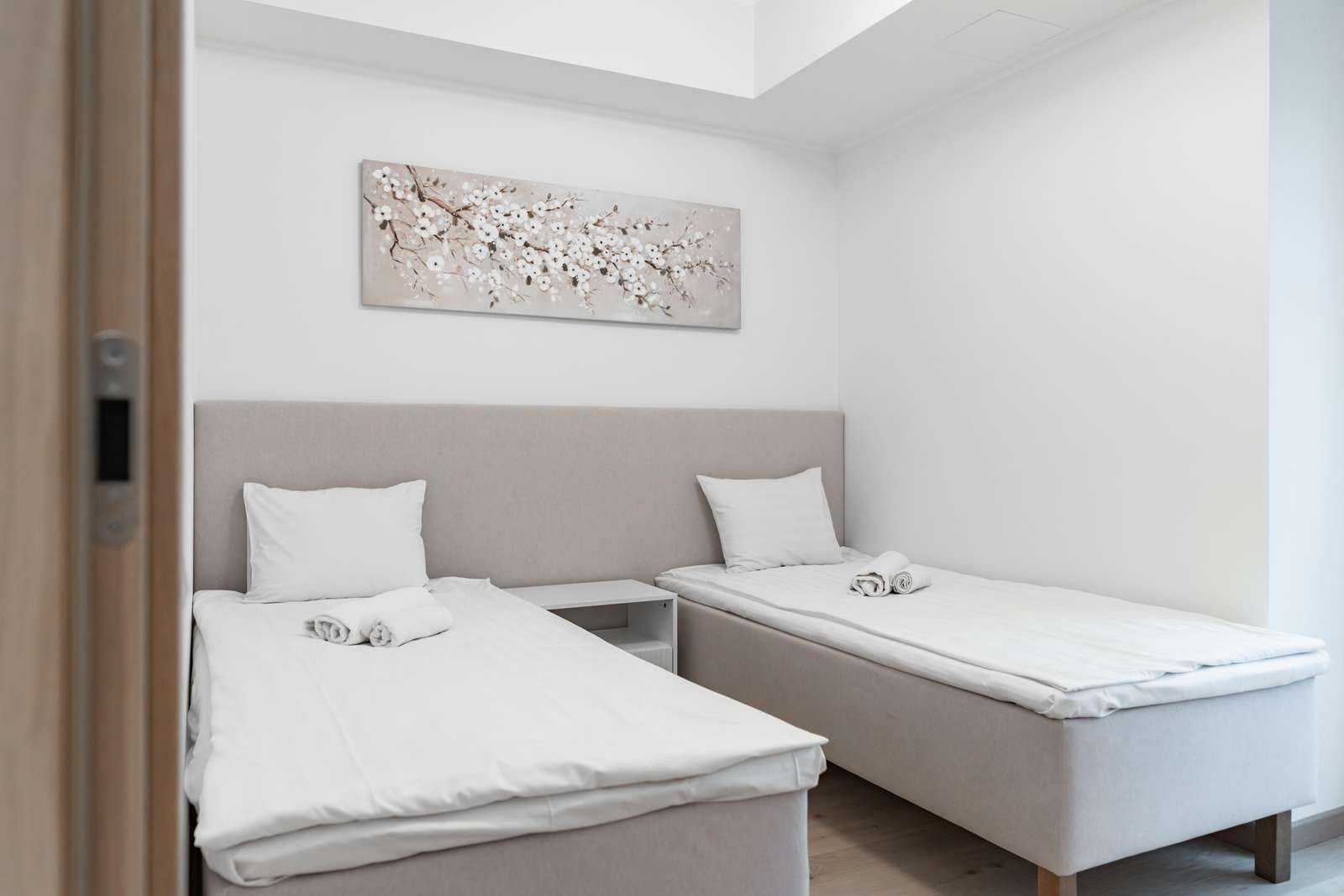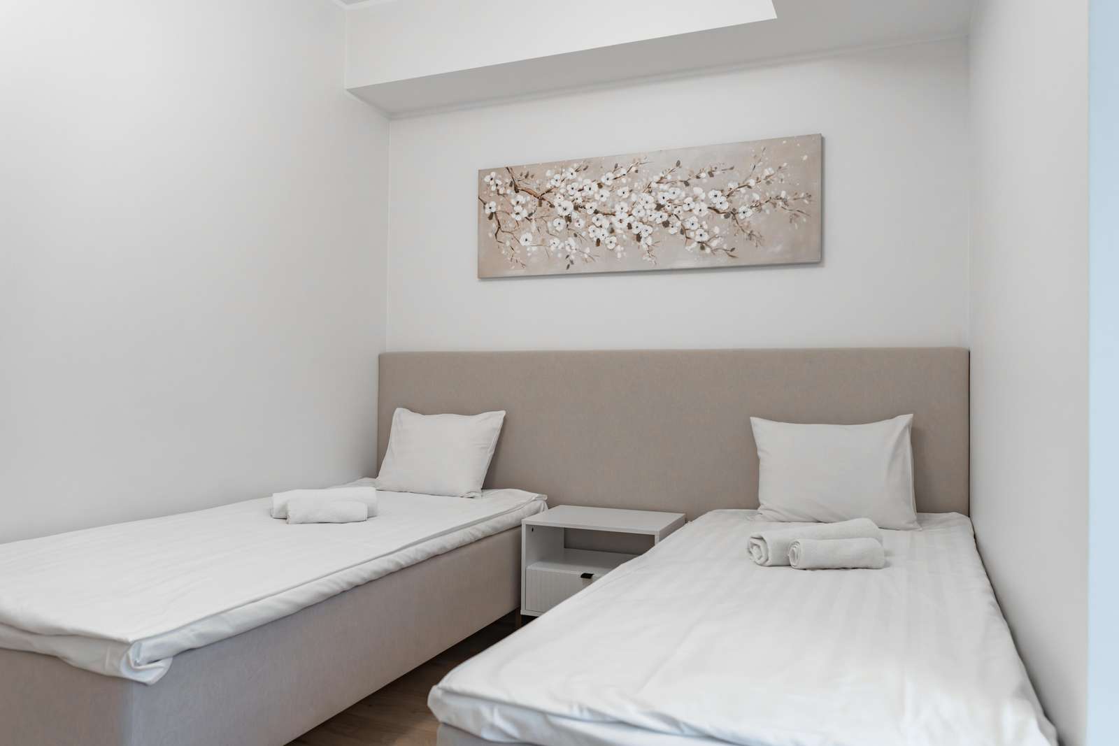 ⬩Bedroom 2: Two single beds and large windows for natural light.
