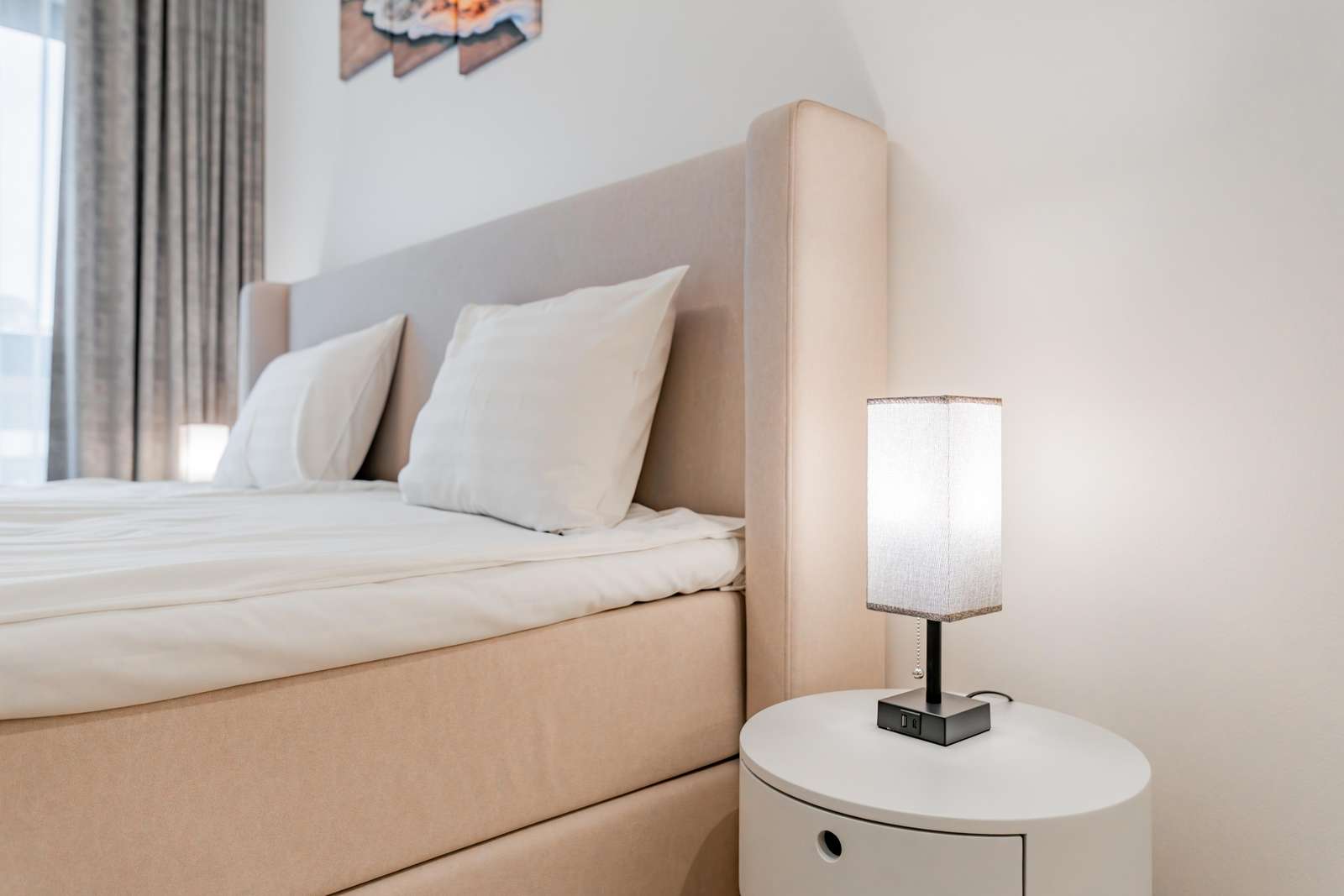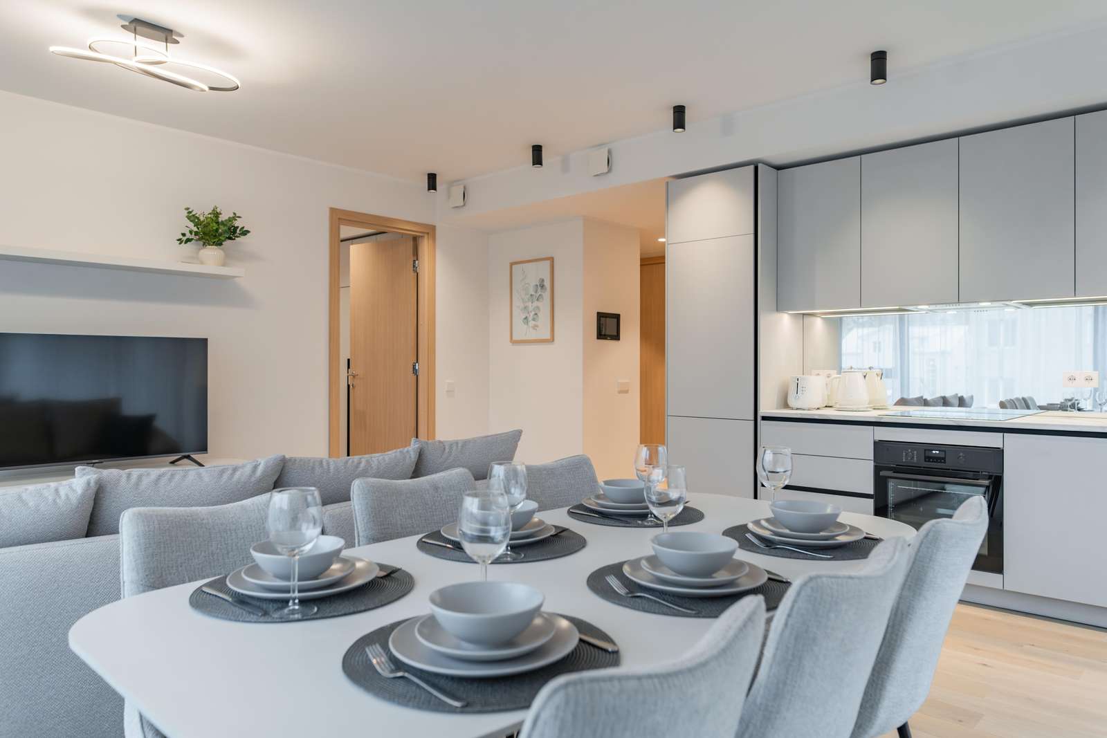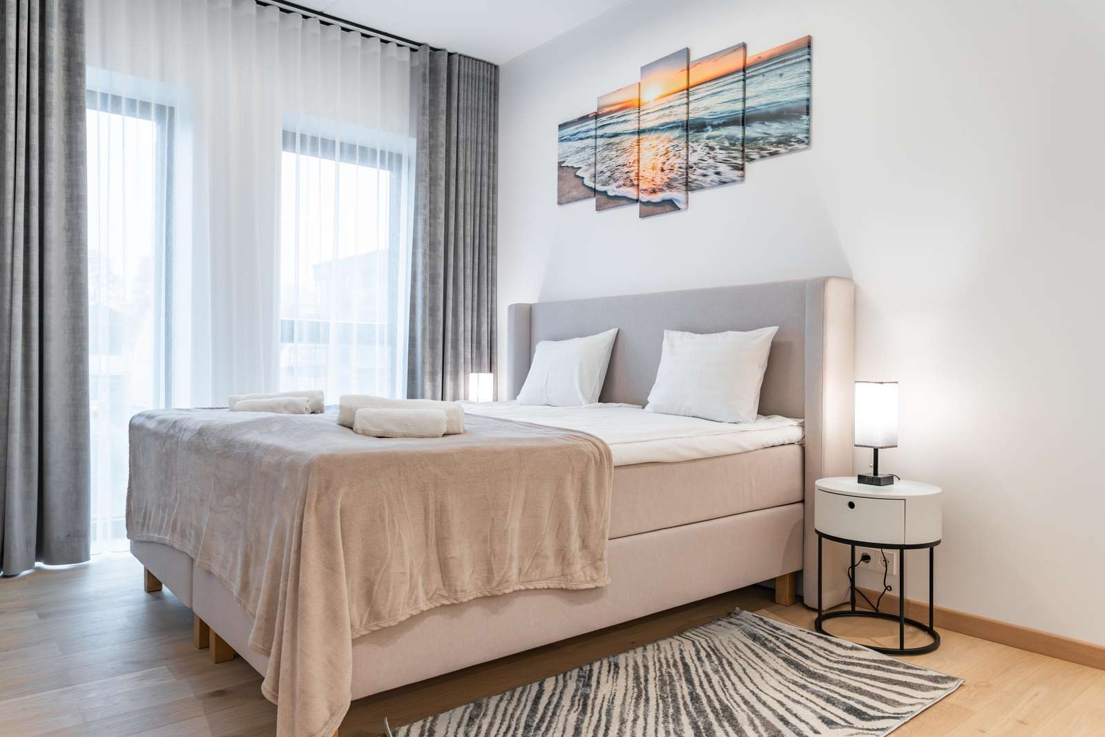 Stay in a spacious and modern 2-bedroom apartment with balcony and view to the sea! Apartment has a bright living room, furnished balcony, two bedrooms, fully equipped kitchen and a shower. Perfect for couples, small families and business travellers. Free 100MB Wi-Fi, stylish interior and underground parking makes your stay comfortable and convenient.