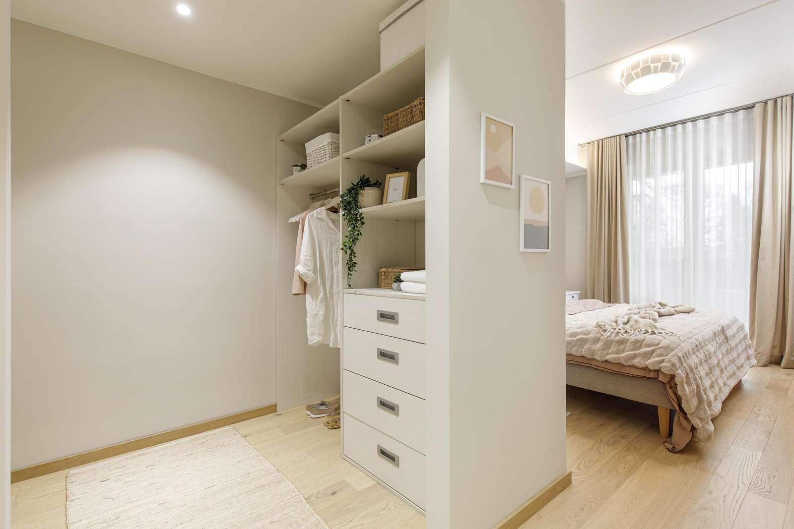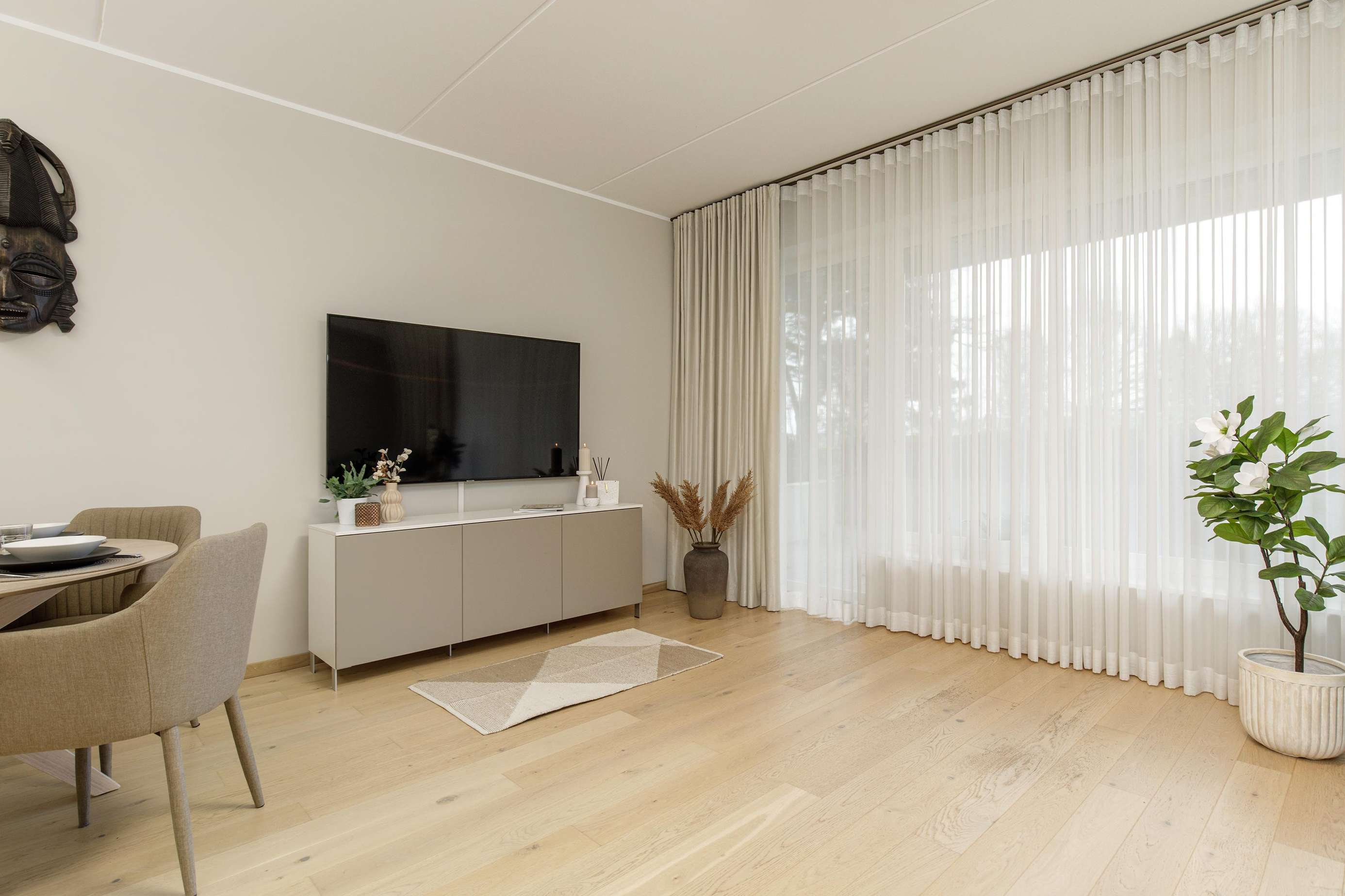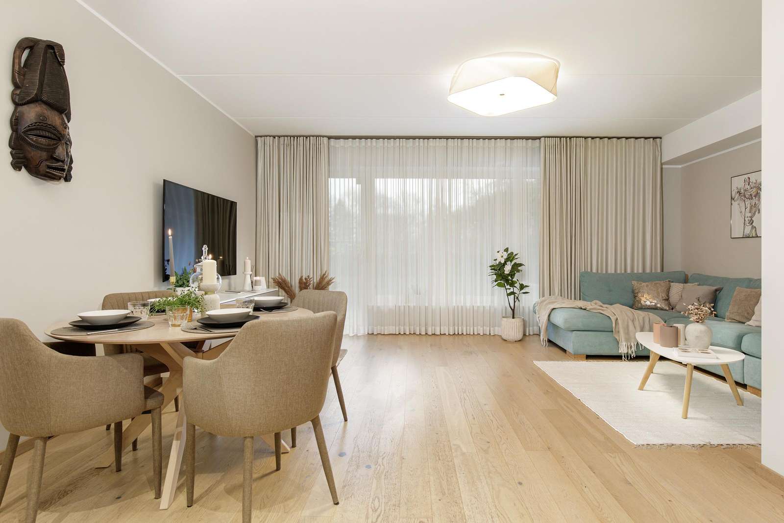 ⬩ Living room: Bright open-plan space with sofa, TV, central heating, and large windows for natural light.