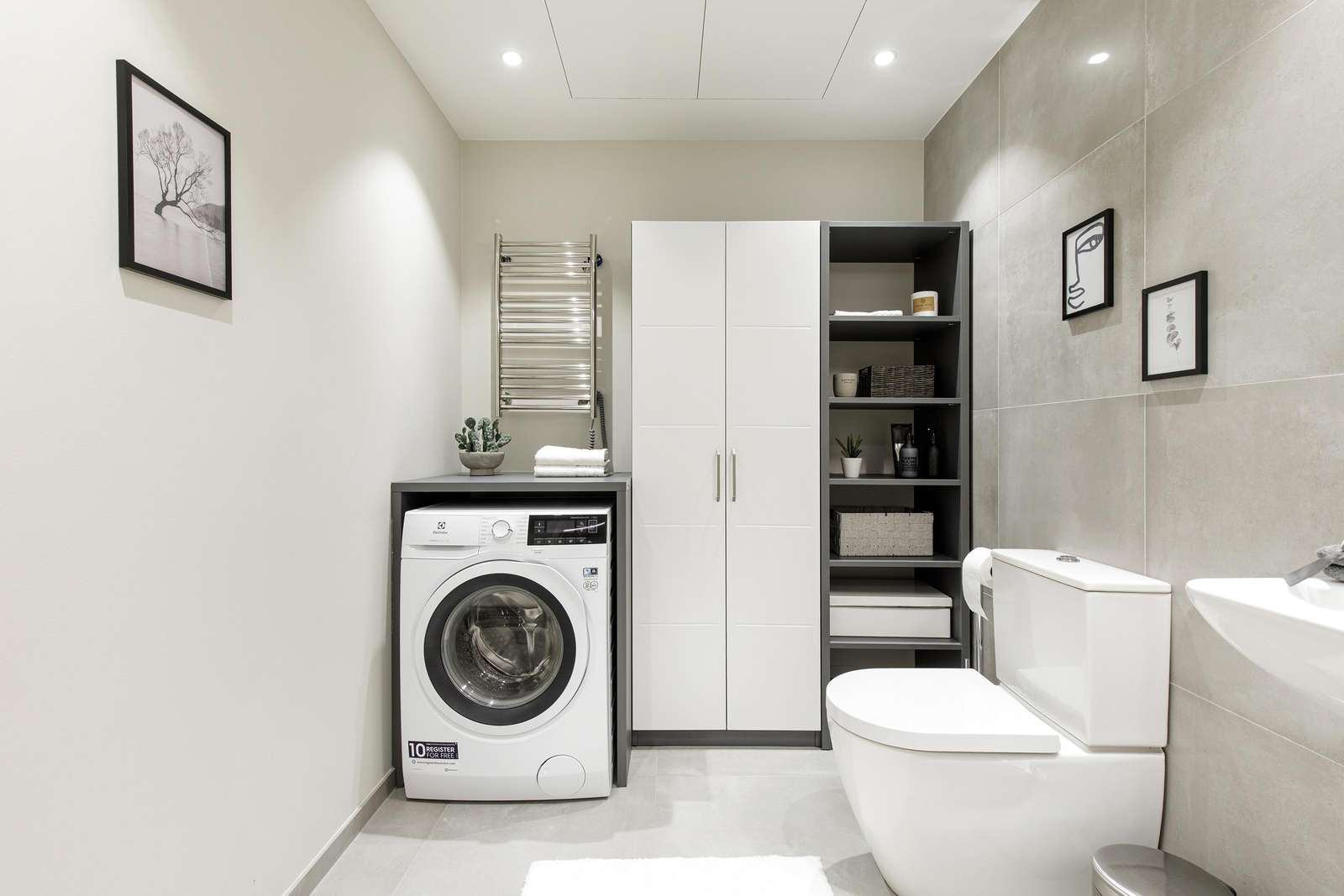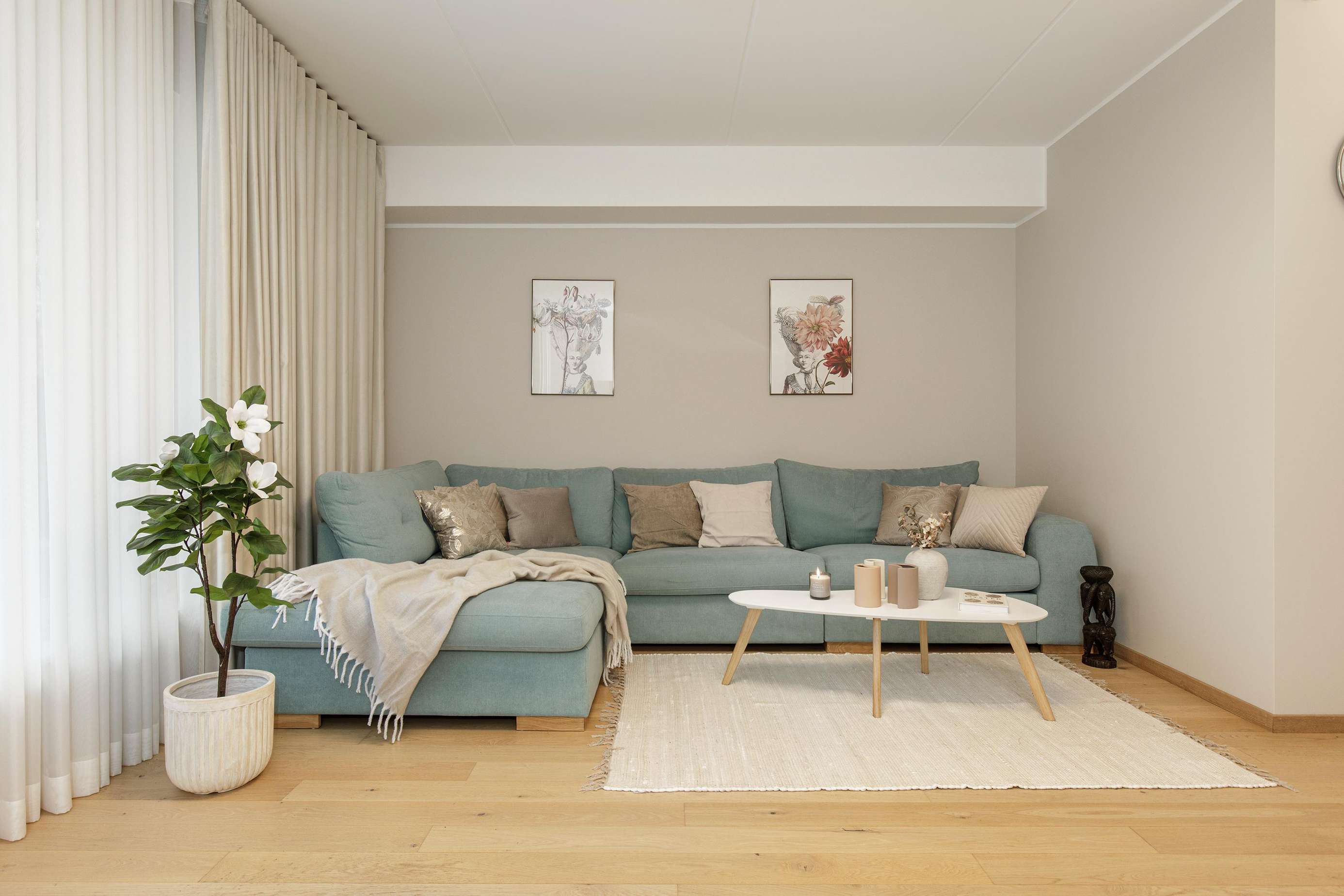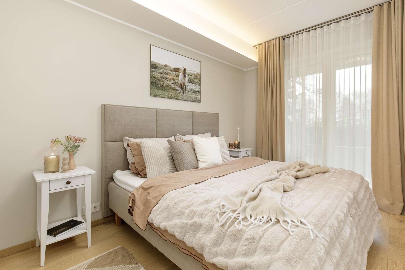 ⬩ Living room: Bright open-plan space with sofa, TV, central heating, and large windows for natural light.