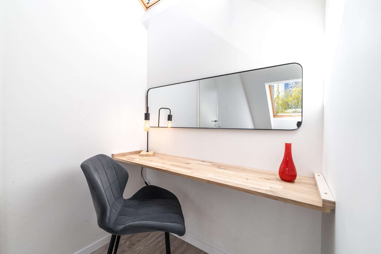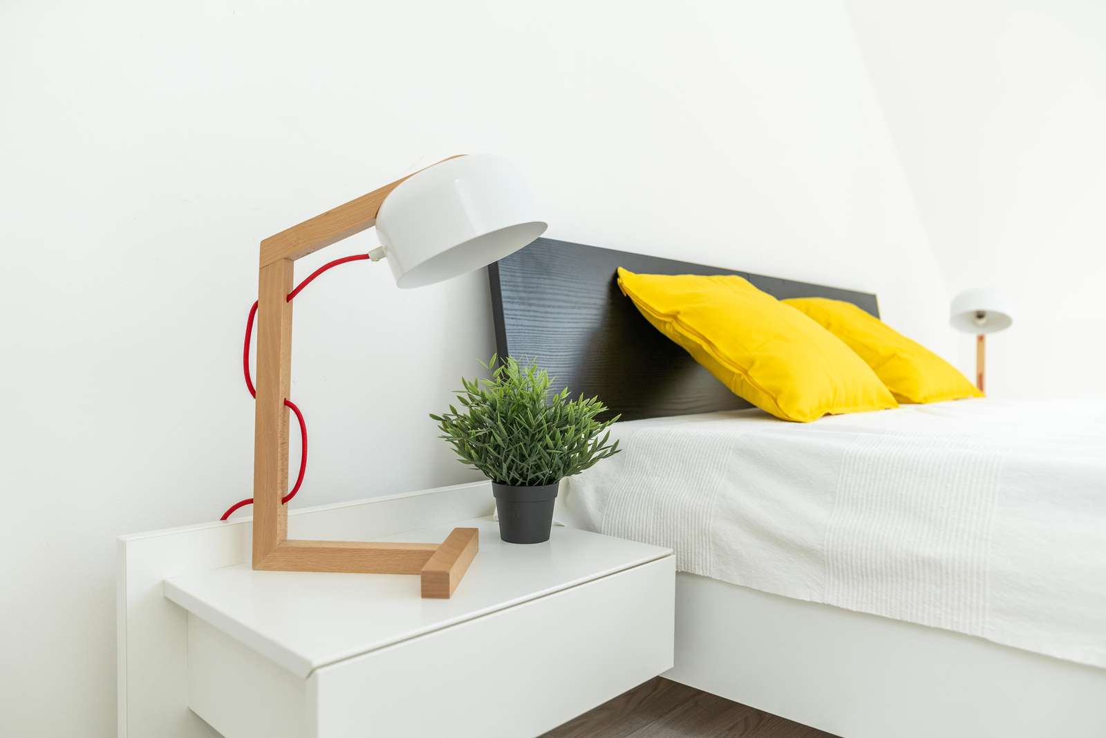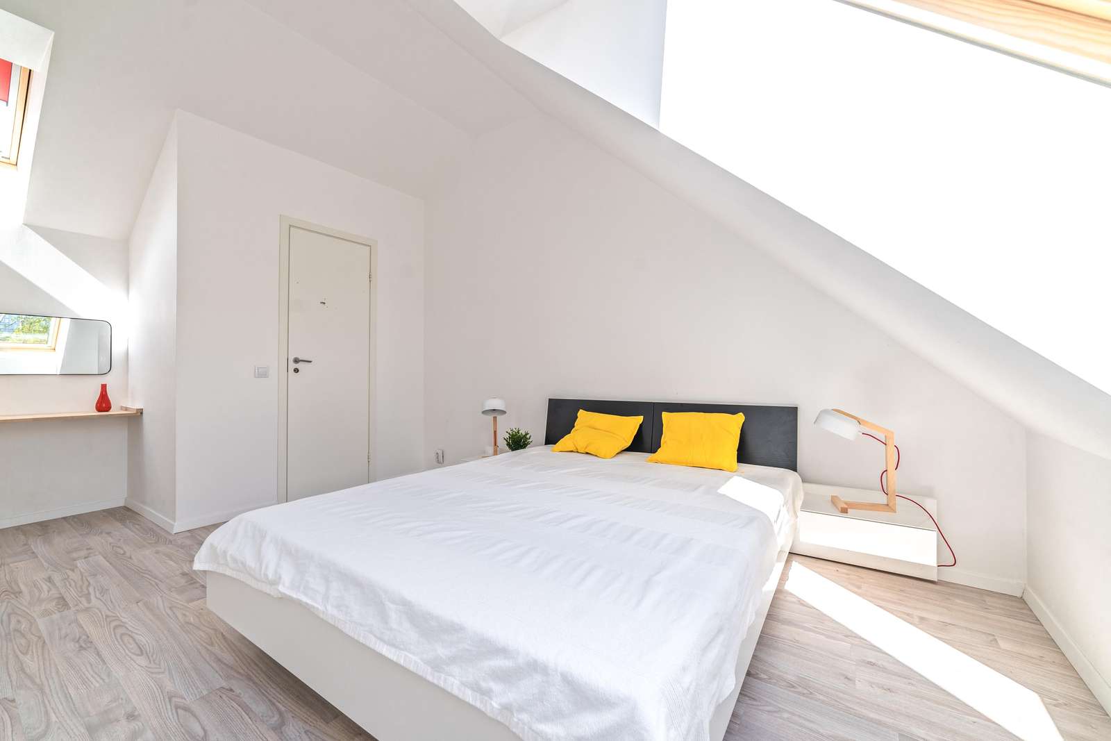 ⬩ Bedroom 1: King-size bed with fresh linens, wardrobe, and a desk space. Easy access to the main bathroom.