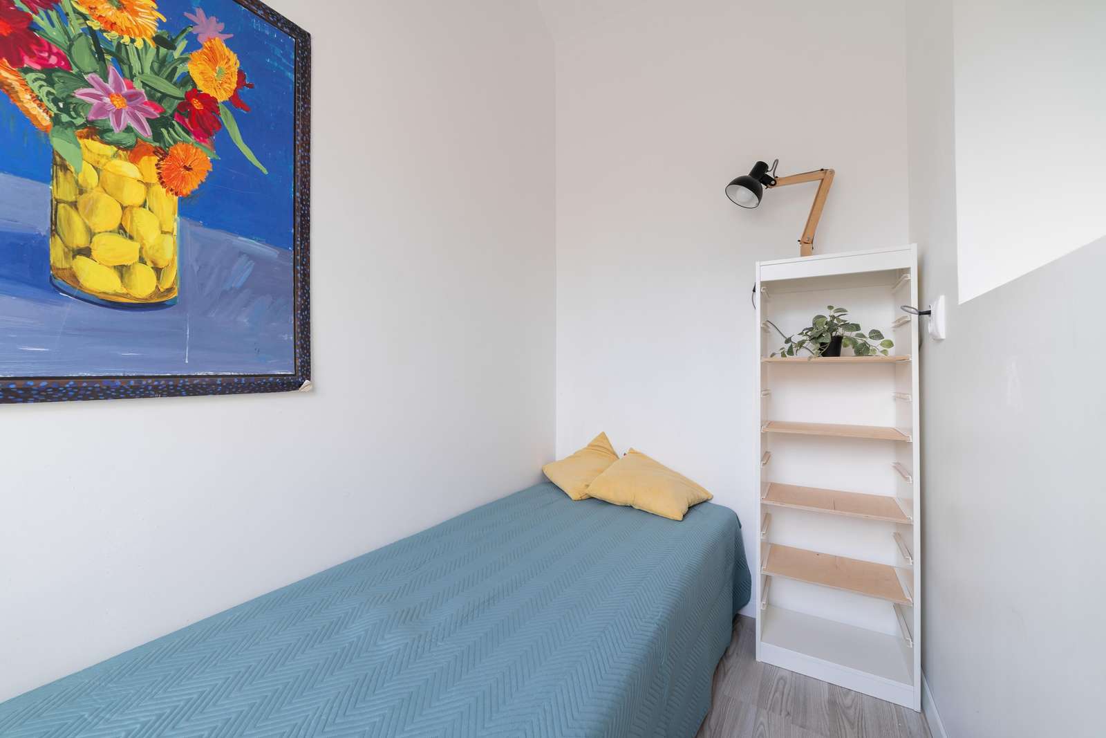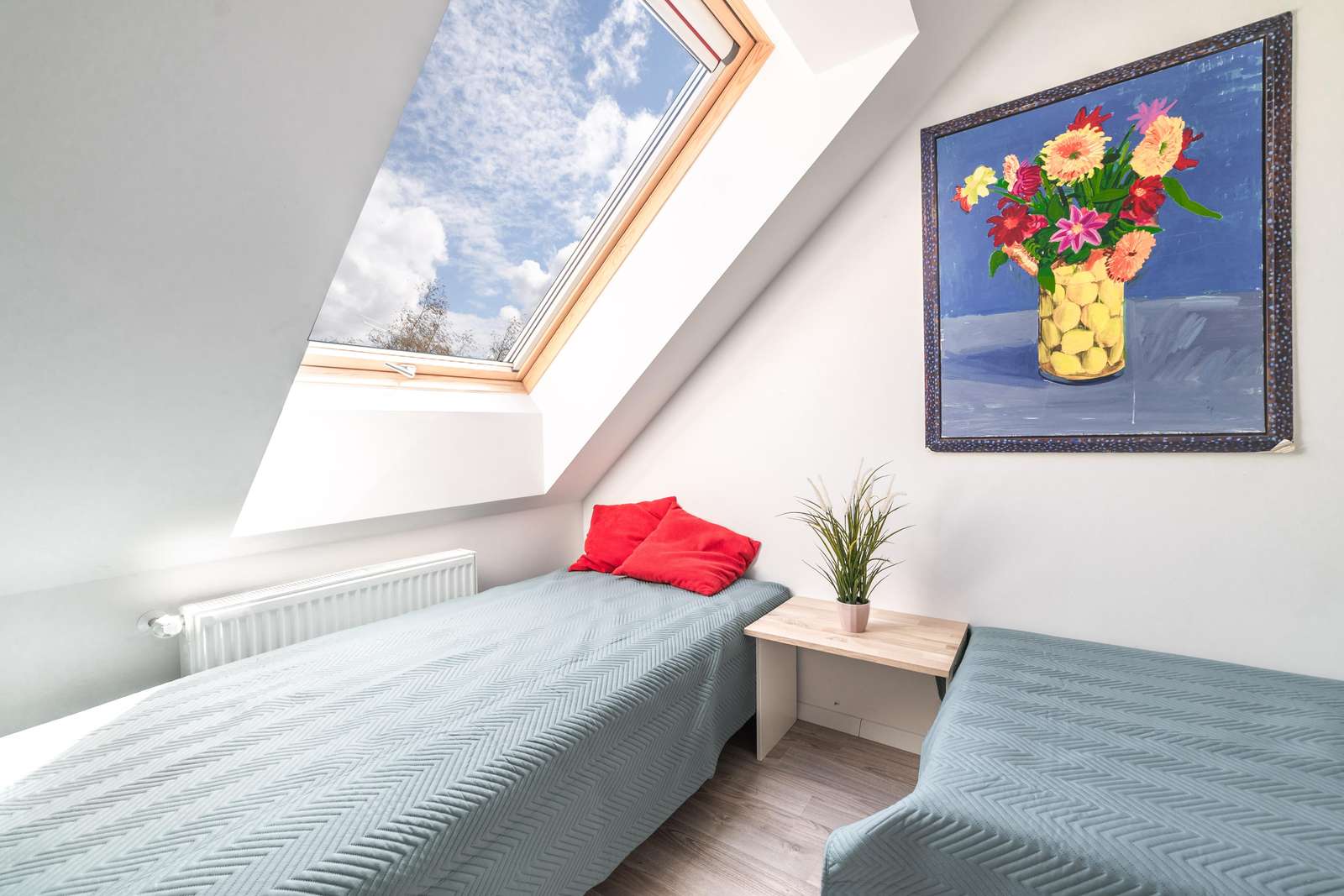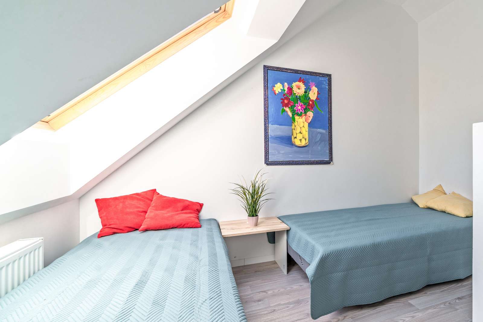 ⬩ Bedroom 2: Two single beds with room-darkening shades, ideal for friends or children.