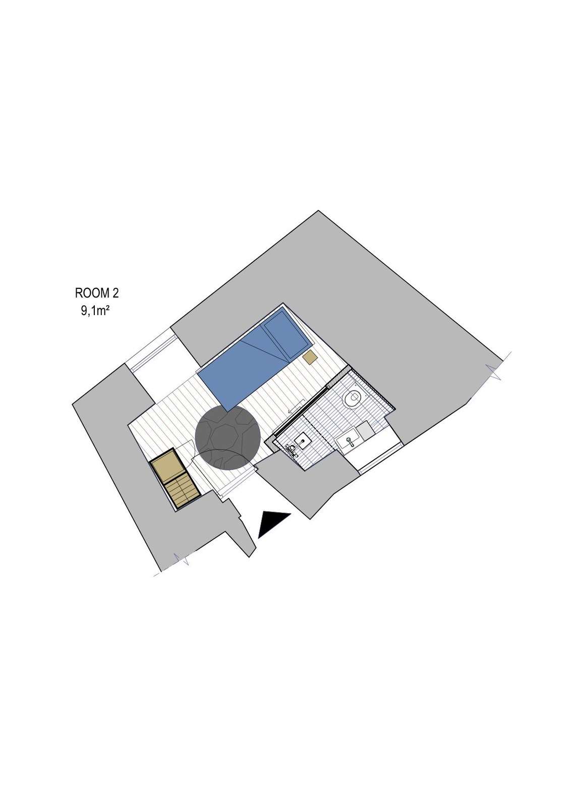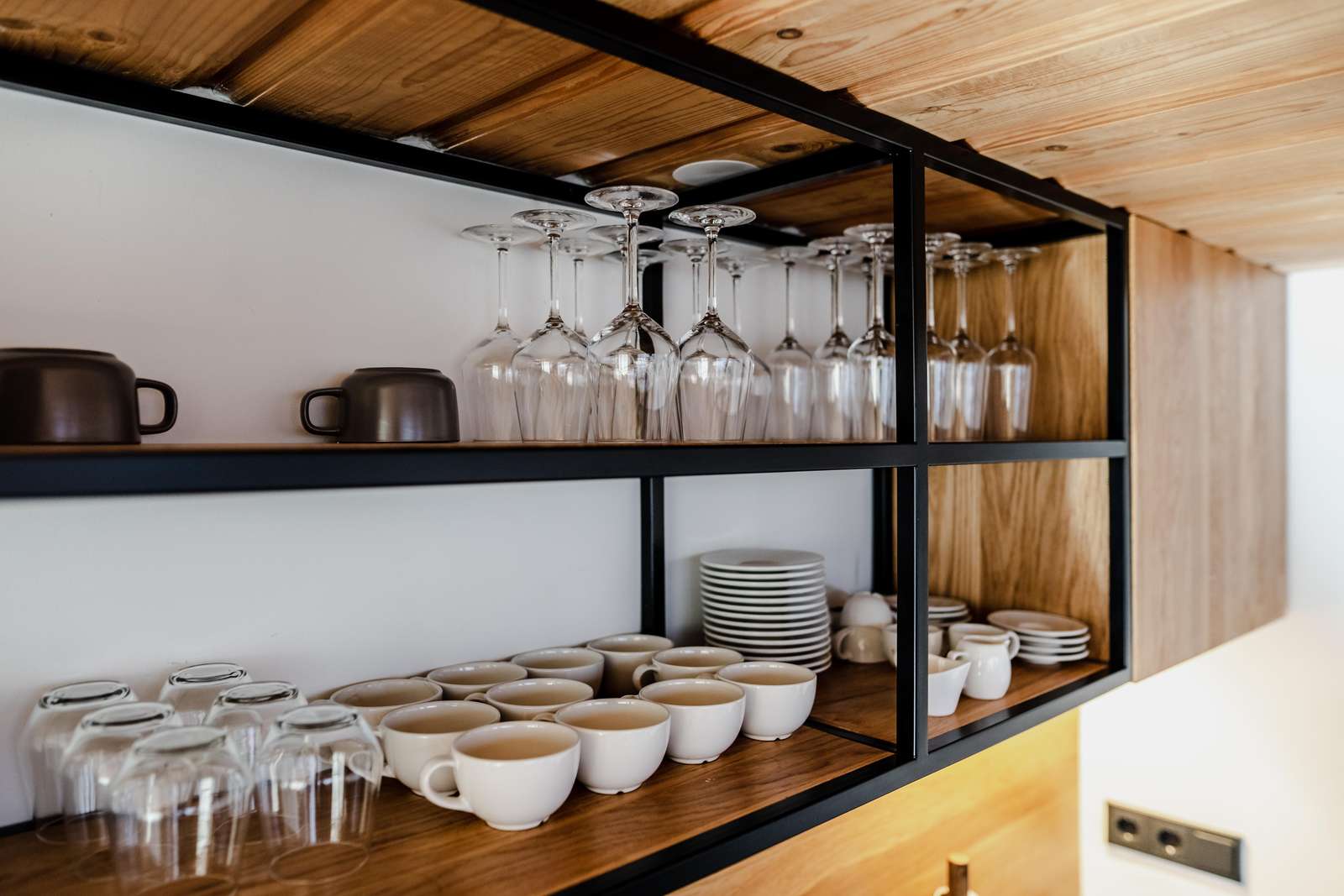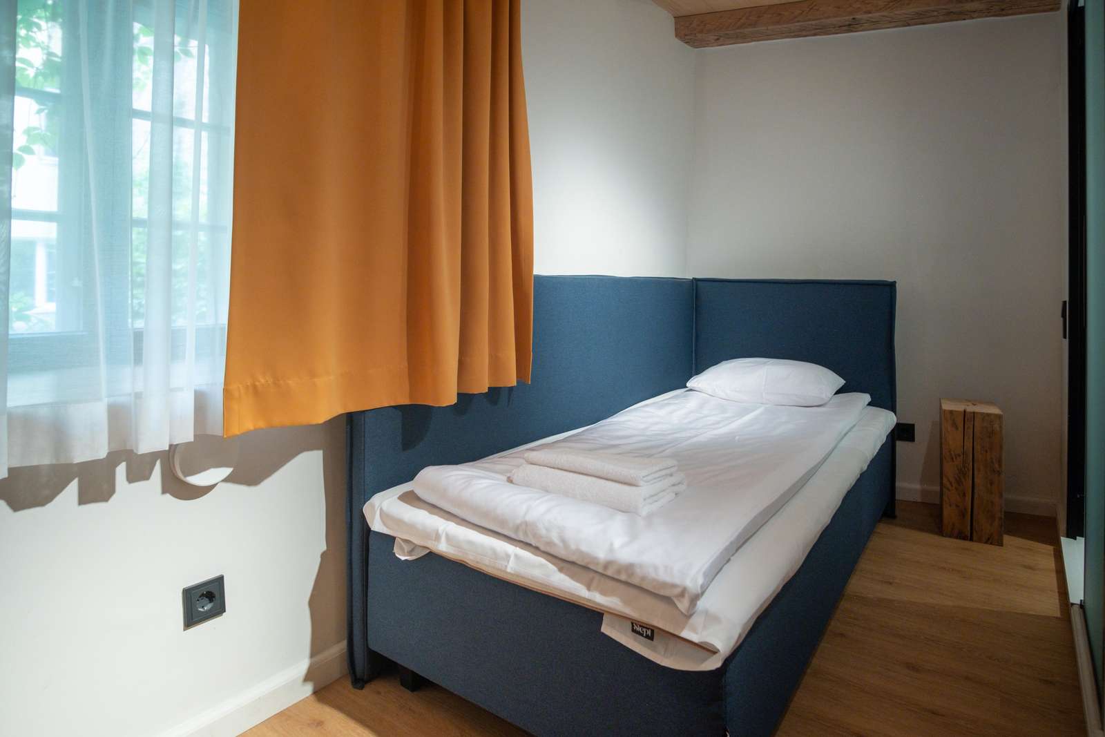 ⬩ Bedroom: Single bed, fresh linens, hangers, room-darkening shades, heating. Private and tastefully decorated with stone details. A coffee machine, complimentary capsules, and a fridge are included in the room.