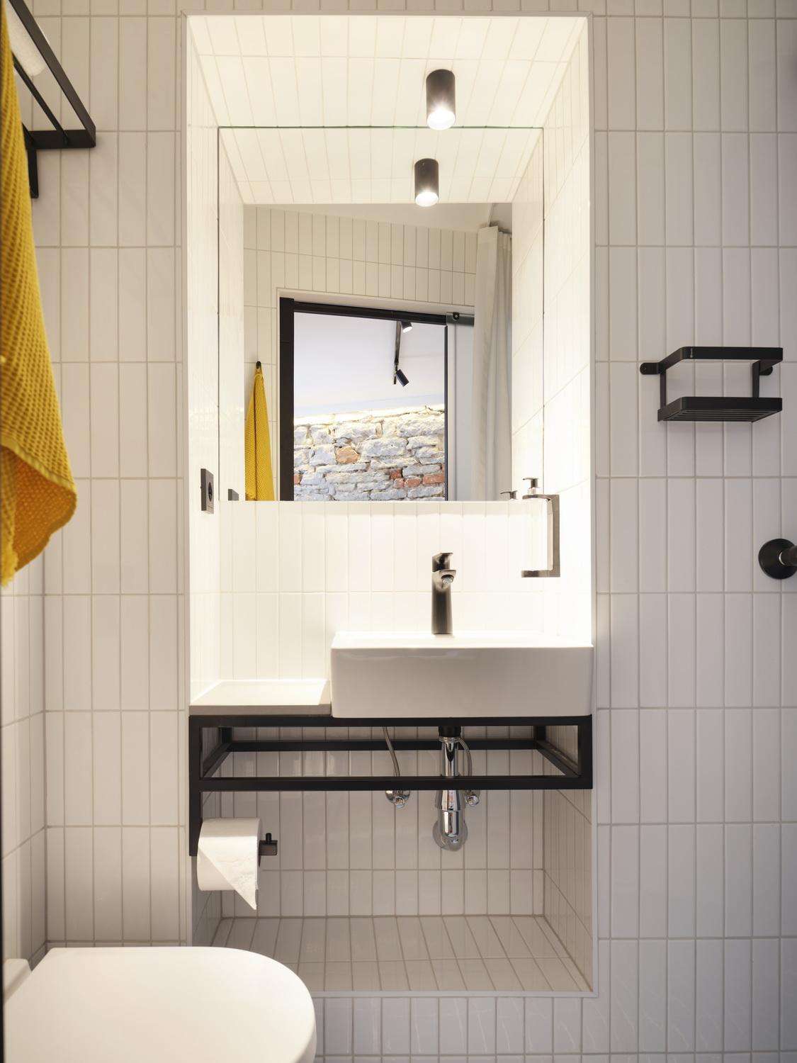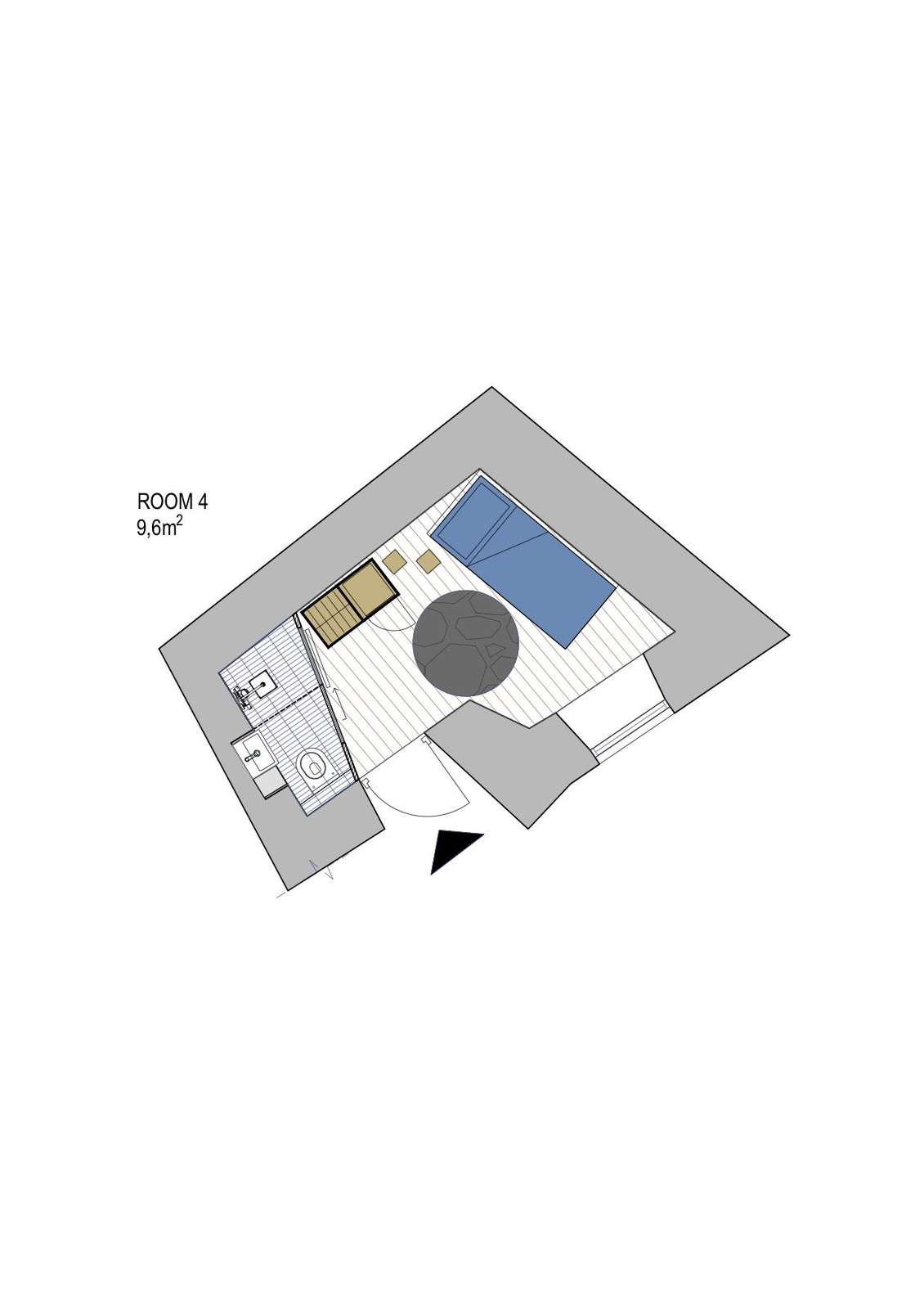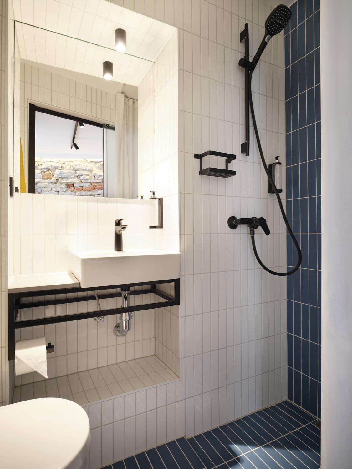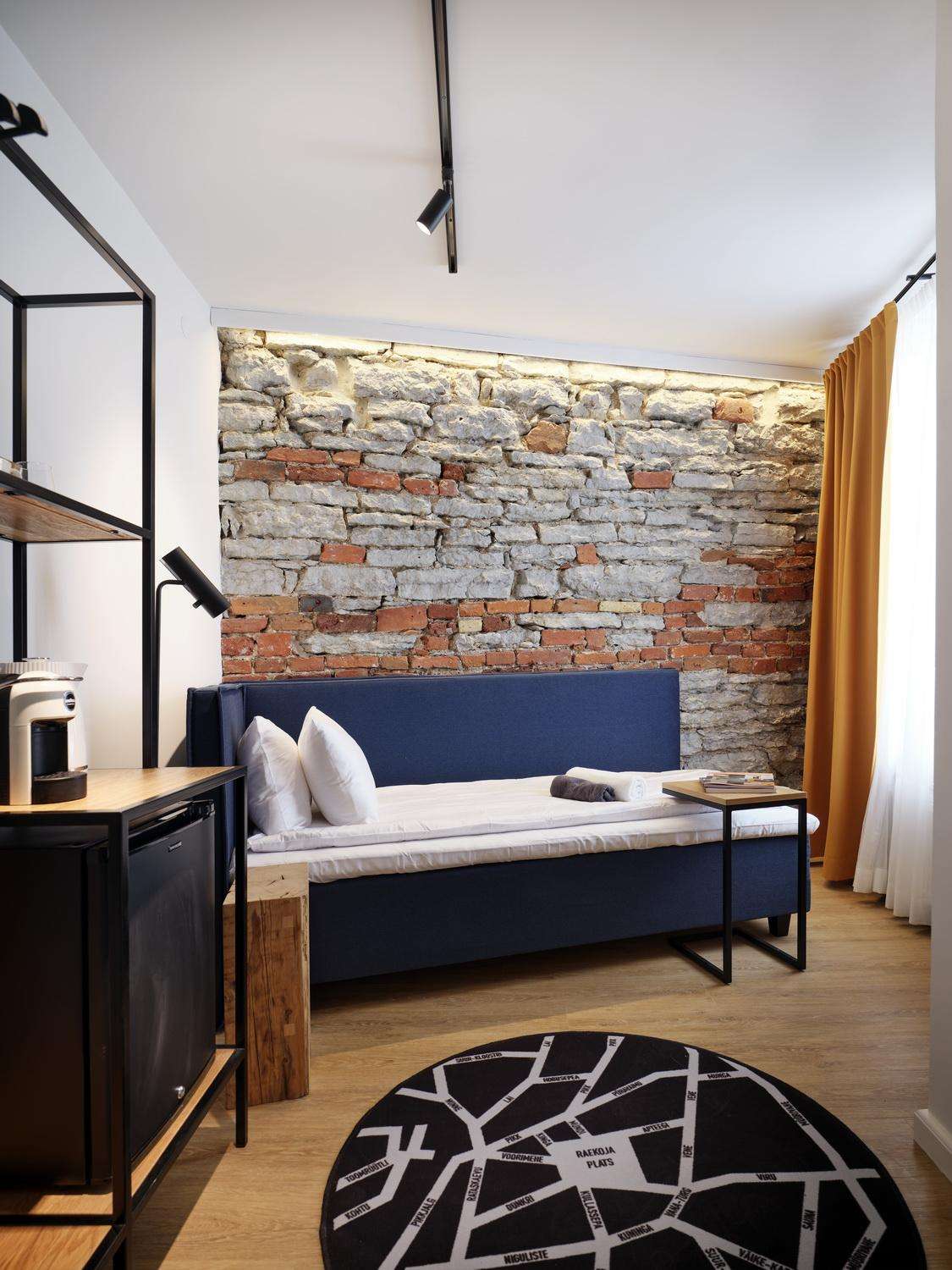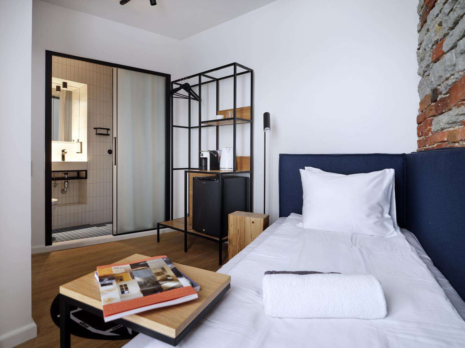 ⬩ Bedroom: Single bed, fresh linens, hangers, room-darkening shades, heating. Private and tastefully decorated with stone details. A coffee machine, complimentary capsules, and a fridge are included in the room.
