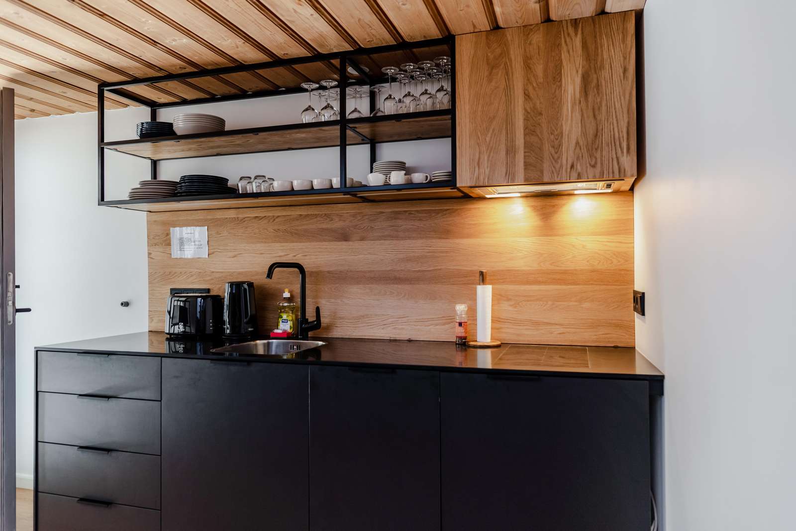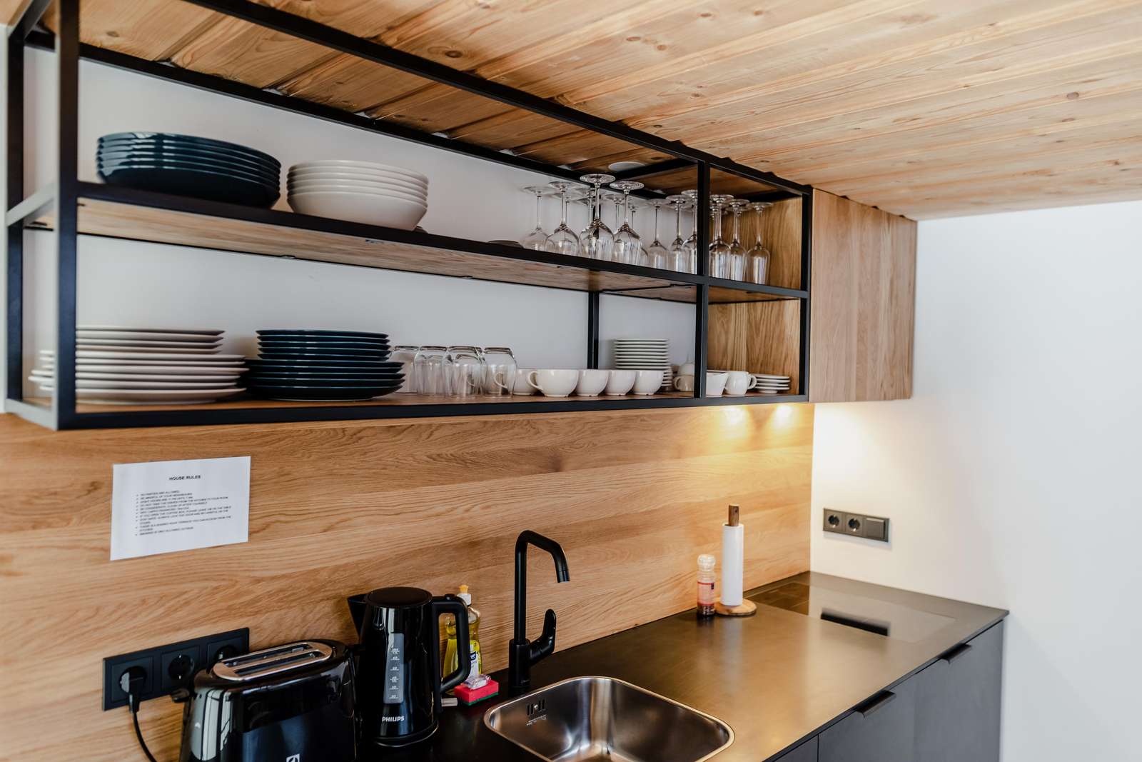 ⬩ Kitchen (shared, top floor): Microwave, stove, dishwasher, kettle, toaster, wine glasses, cooking basics, dishes and silverware, dining table.