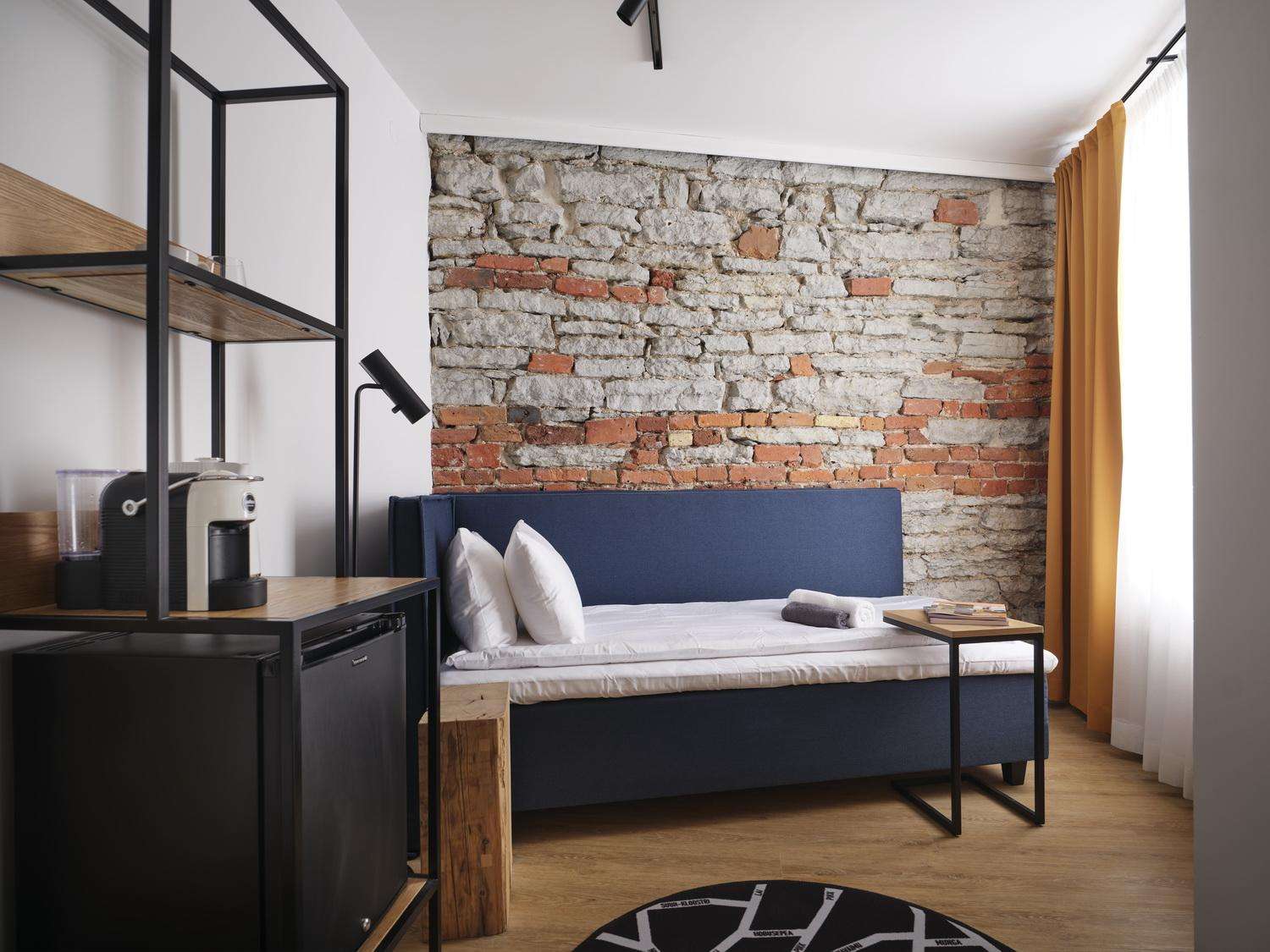 ⬩ Bedroom: Single bed, fresh linens, hangers, room-darkening shades, heating. Private and tastefully decorated with stone details. A coffee machine, complimentary capsules, and a fridge are included in the room.