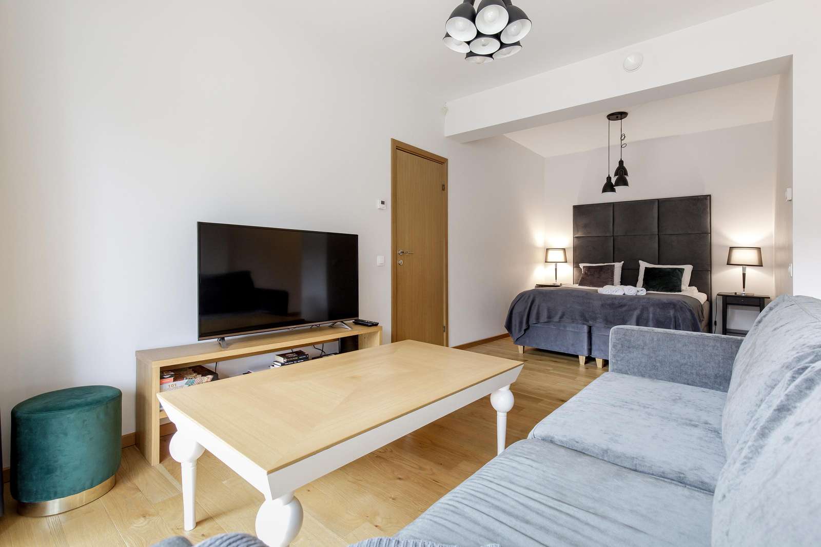 ⬩ Living room: Comfortable sofa bed, TV, books, and access to the private balcony.