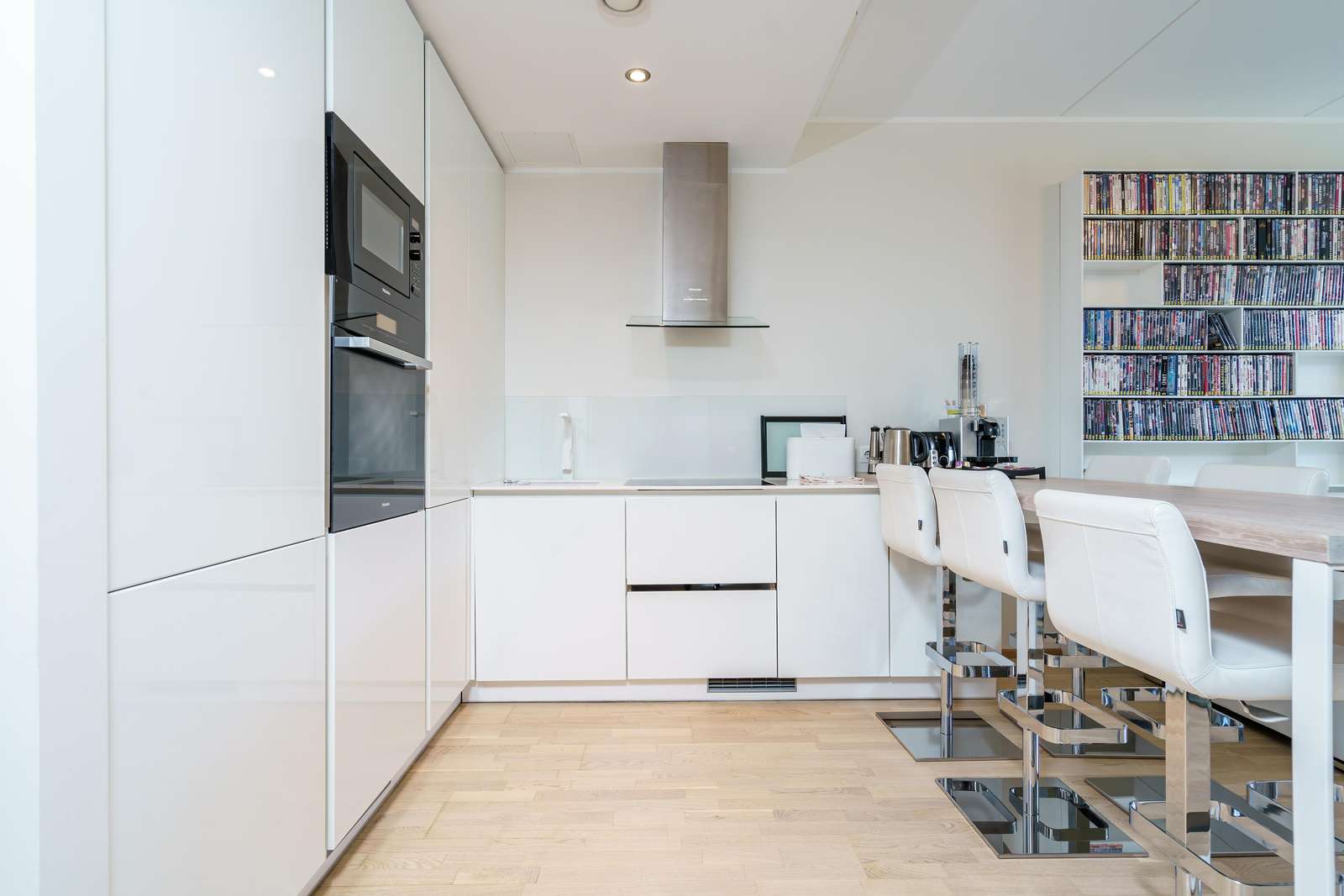 ⬩ Kitchen & dining: Modern, fully equipped kitchen with refrigerator, stove, oven, microwave, dishwasher, hot-water kettle, coffee maker, cooking basics, dishes and silverware, trash compactor, and a dining table.