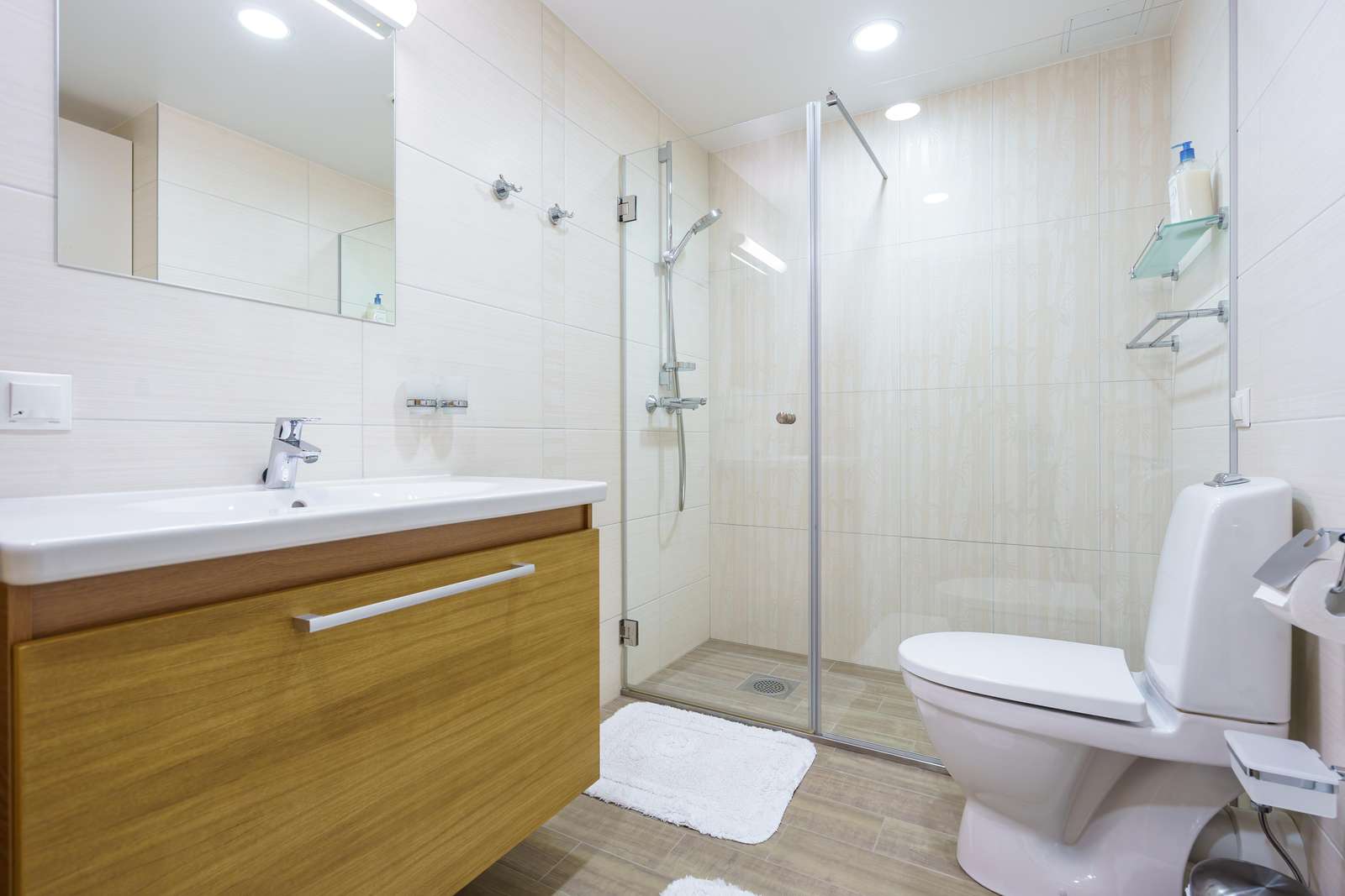 ⬩ Bathroom: Walk-in shower, toilet, hair dryer, body soap, and hot water.