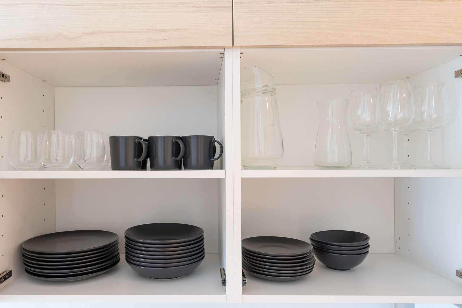 ⬩ Kitchen & dining: Modern kitchen with refrigerator, stove, oven, dishwasher, hot-water kettle, coffee maker, cooking basics, dishes and silverware, wine glasses, and a dining counter for two.