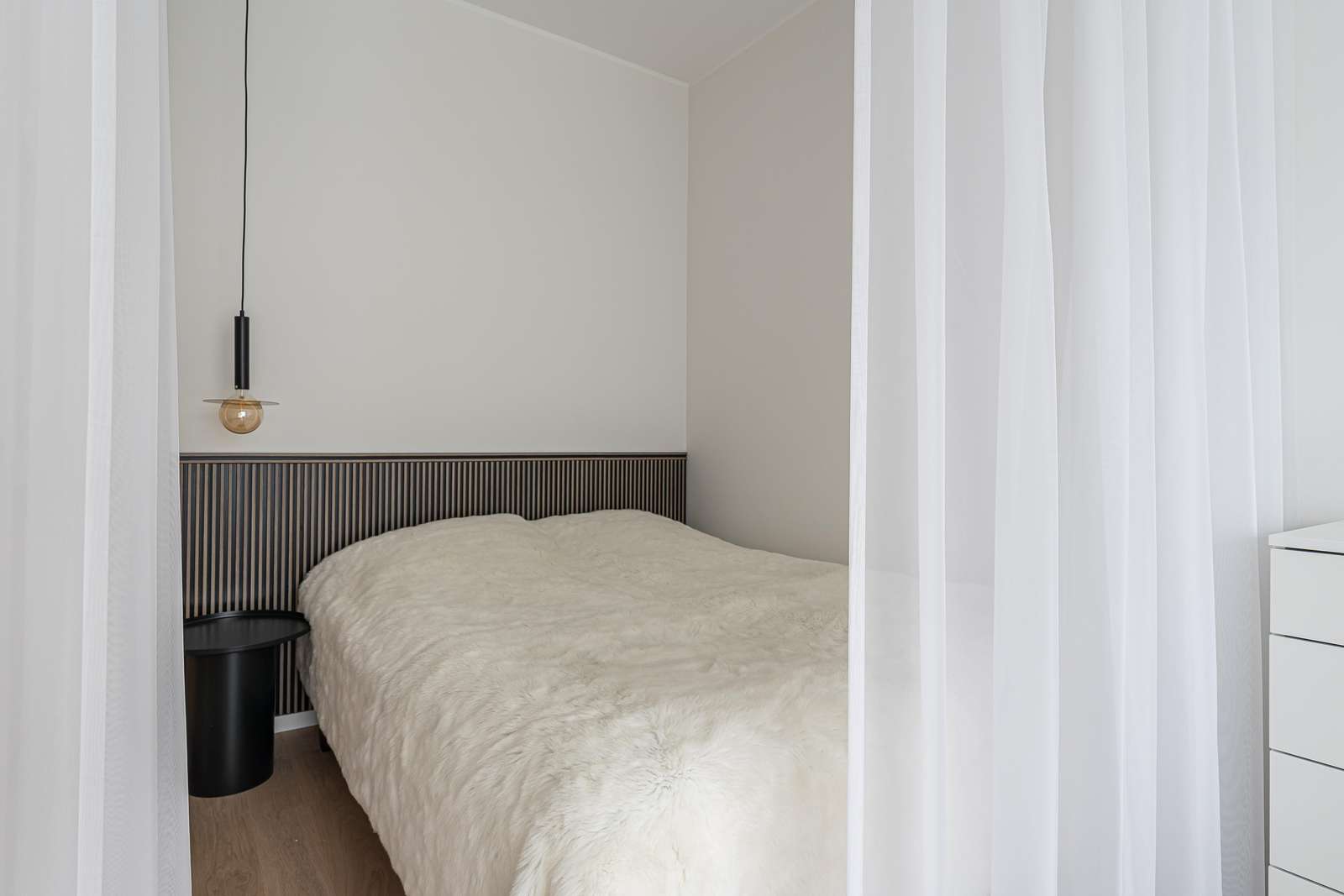 ⬩ Bedroom area: Cozy double bed with cotton linens and closet storage, separated by light curtains for privacy.